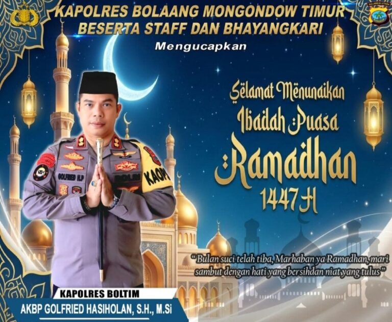 BERITATOTABUAN.COM, BOLTIM – Sebagai bentuk penghormatan dan dukungan institusi Polri kepada seluruh umat muslim yang ada di wilayah Kabupaten Mongondow Timur (Boltim), Kapolres Boltim AKBP Golfried Hasiholan, S.H., M.Si menyampaikan pesan damai menjelang datangnya bulan suci Ramadhan 1447 Hijriah.