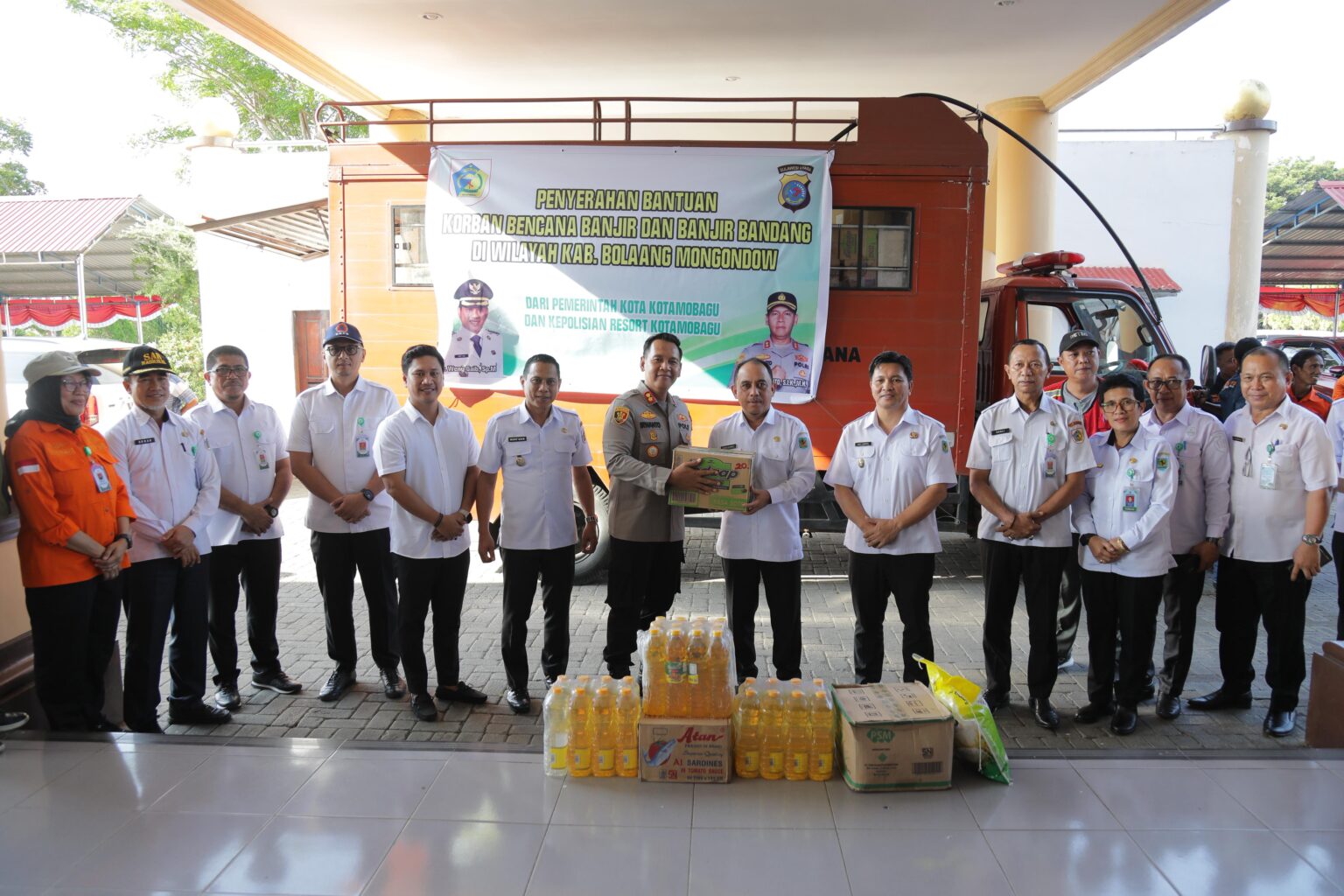 Wali Kota hadir bersama Wakil Wali Kota Rendy Virgiawan Mangkat, S.H., M.H., serta Kapolres Kotamobagu AKBP Irwanto, S.I.K., M.H. Bantuan diterima oleh Bupati Bolmong, Yusra Alhabsyi, S.E., M.Si., didampingi Wakil Bupati Dony Lumenta.