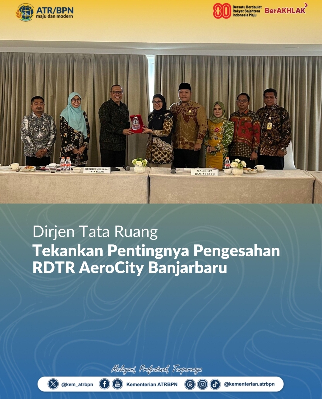 BERITATOTABUAN.COM, NASIONAL – Direktur Jenderal (Dirjen) Tata Ruang Kementerian Agraria dan Tata Ruang/Badan Pertanahan Nasional (ATR/BPN), Suyus Windayana, menekankan pentingnya percepatan pengesahan Rencana Detail Tata Ruang (RDTR) Wilayah Perencanaan (WP) AeroCity Kota Banjarbaru Tahun 2025–2045. Ia menilai, RDTR ini strategis untuk mendukung kepastian investasi dan kemudahan berusaha.