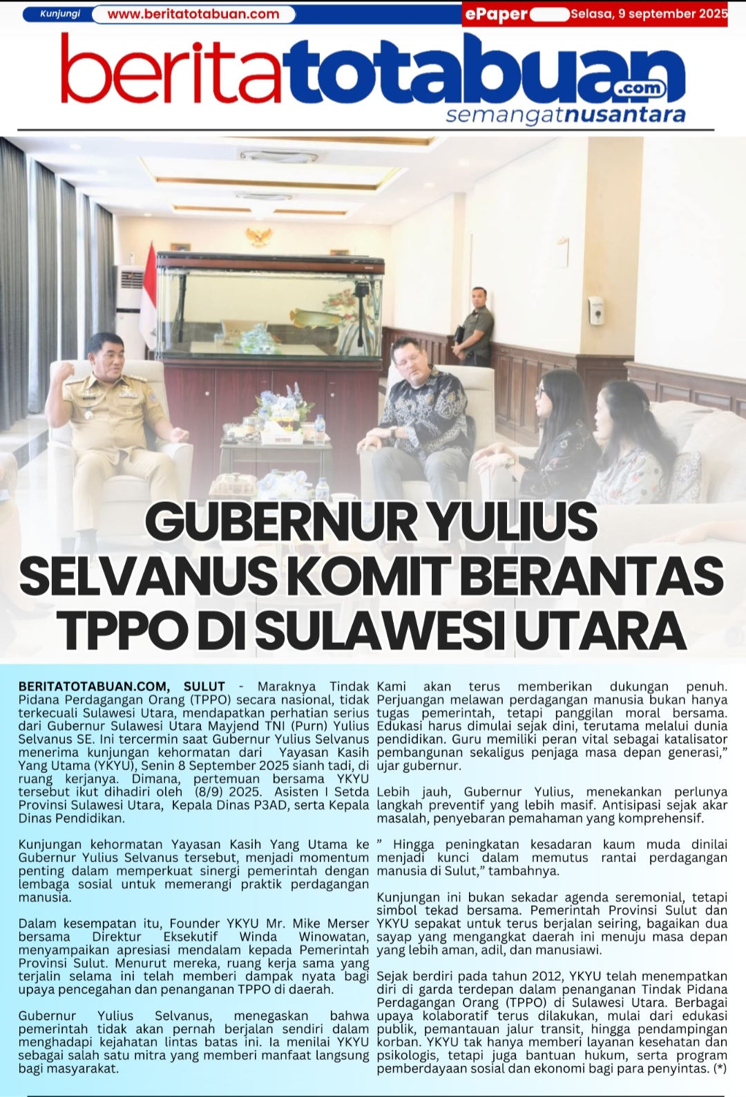 Ini tercermin saat Gubernur Yulius Selvanus menerima kunjungan kehormatan dari Yayasan Kasih Yang Utama (YKYU), Senin 8 September 2025 sianh tadi, di ruang kerjanya. Dimana, pertemuan bersama YKYU tersebut ikut dihadiri oleh (8/9) 2025. Asisten I Setda Provinsi Sulawesi Utara, Kepala Dinas P3AD, serta Kepala Dinas Pendidikan.