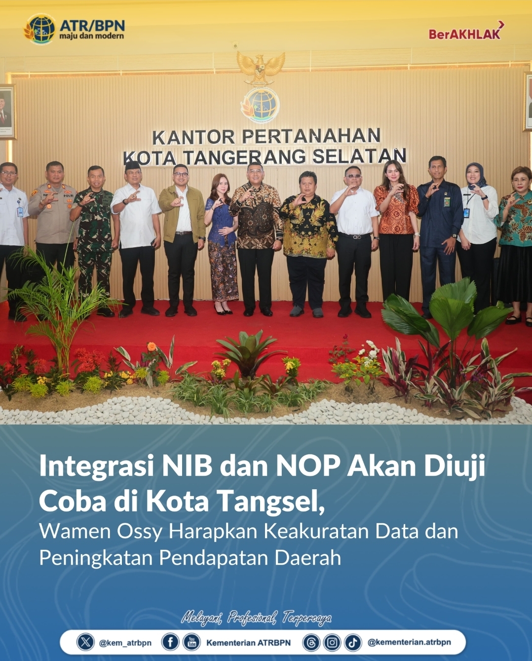 BERITATOTABUAN.COM, NASIONAL – Pilot Project Integrasi Nomor Identifikasi Bidang (NIB) dan Nomor Objek Pajak (NOP) sudah mulai berjalan di Kota Tangerang Selatan (Tangsel). Program hasil kolaborasi Kantor Pertanahan (Kantah) Kota Tangsel dan Pemerintah Kota (Pemkot) Tangsel ini dinilai dapat memberi manfaat nyata bagi masyarakat.