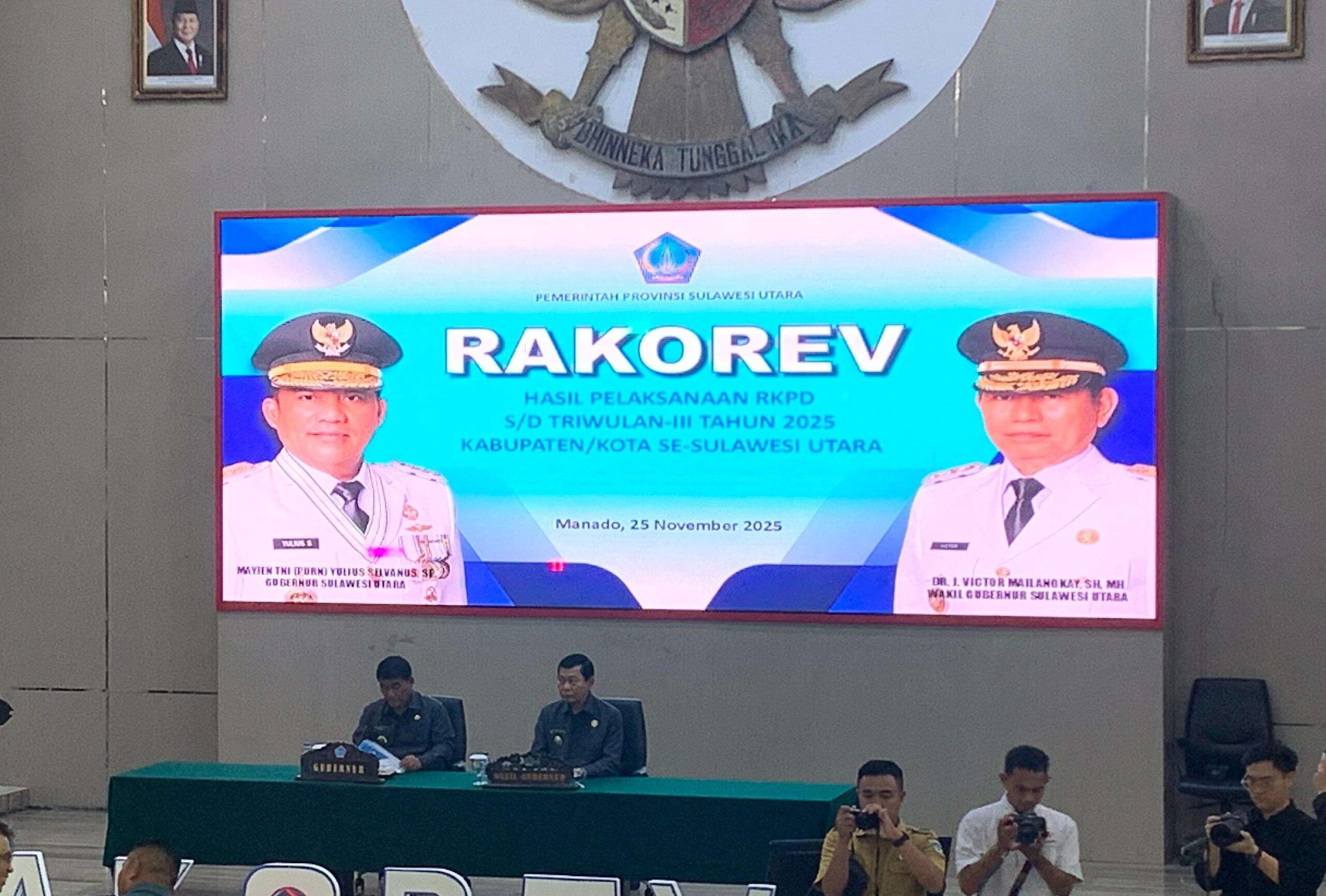 Gubernur Yulius Selvanus memimpin langsung Rakorev itu, di aula Mapalus Graha Gubernuran, Selasa (26/11/2025) siang tadi.