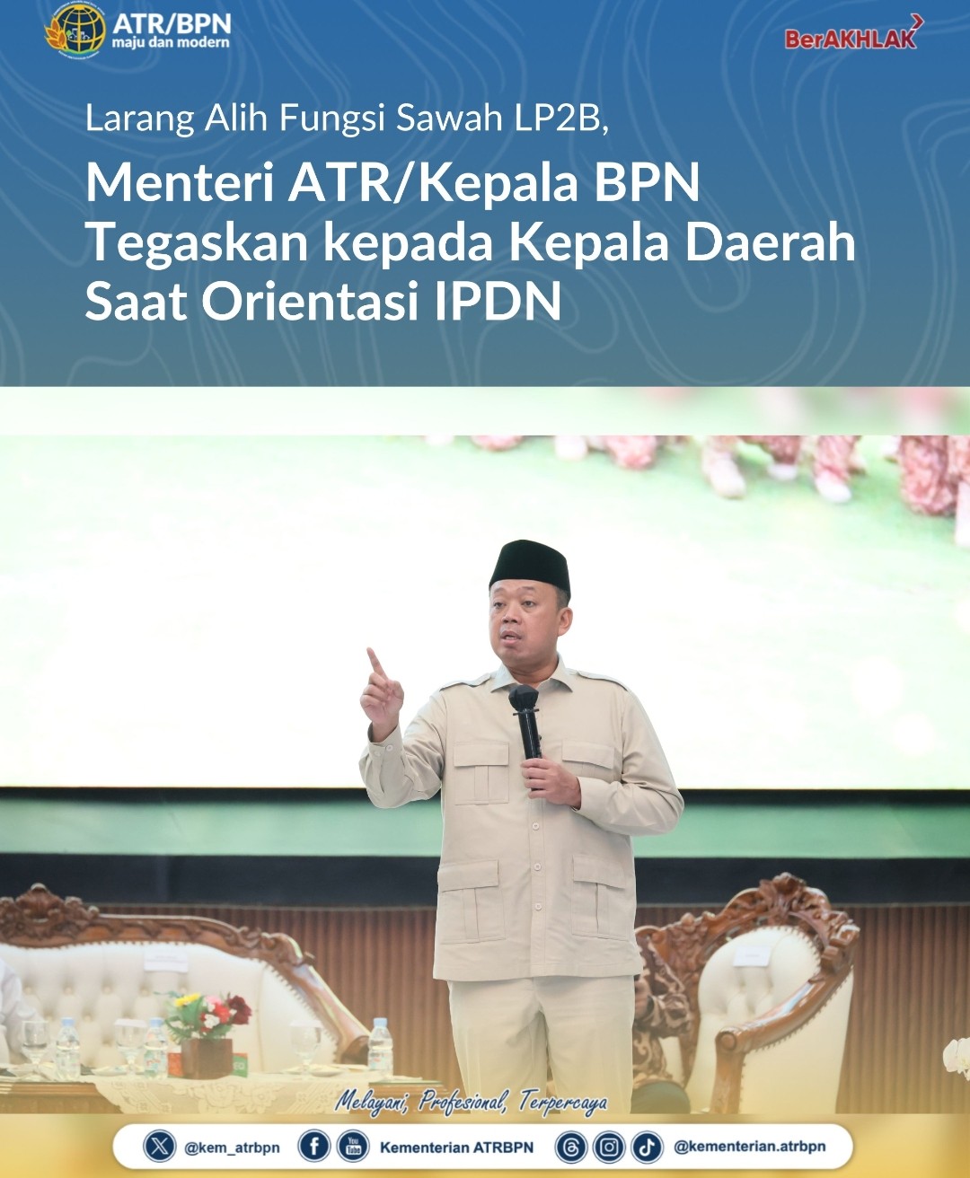 “Yang boleh dikeluarkan izinnya hanya untuk lahan non-LP2B. Sawah LP2B itu mutlak tidak boleh dialihfungsikan. Ini penting saya tekankan kepada para bupati dan wali kota karena banyak sawah hilang akibat rekomendasi yang tidak tepat,” ujar Menteri Nusron di hadapan 86 kepala daerah dan wakil kepala daerah.