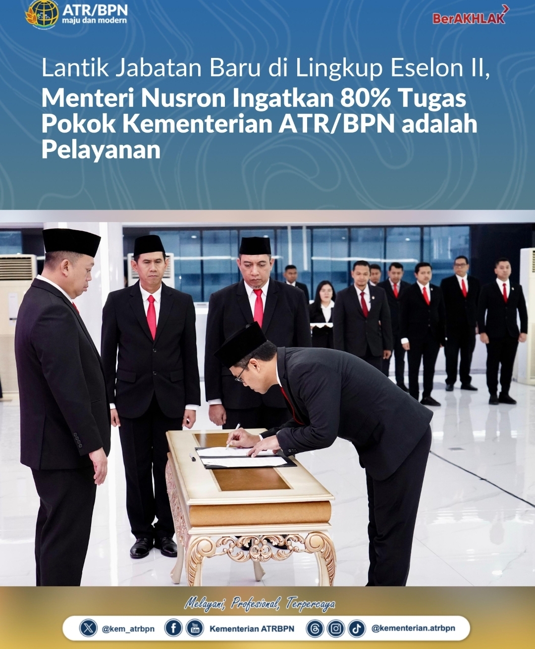 BERITATOTABUAN.COM, NASIONAL – Menteri Agraria dan Tata Ruang/Kepala Badan Pertanahan Nasional (ATR/BPN), Nusron Wahid, melantik sejumlah Pejabat Pimpinan Tinggi Pratama (Eselon II) di lingkungan Kementerian ATR/BPN pada Rabu (23/07/2025). Dalam pelantikan yang berlangsung di Aula Prona, Jakarta ini, Menteri Nusron mengingatkan kembali bahwa inti dari tugas pokok Kementerian ATR/BPN adalah pelayanan kepada masyarakat.
