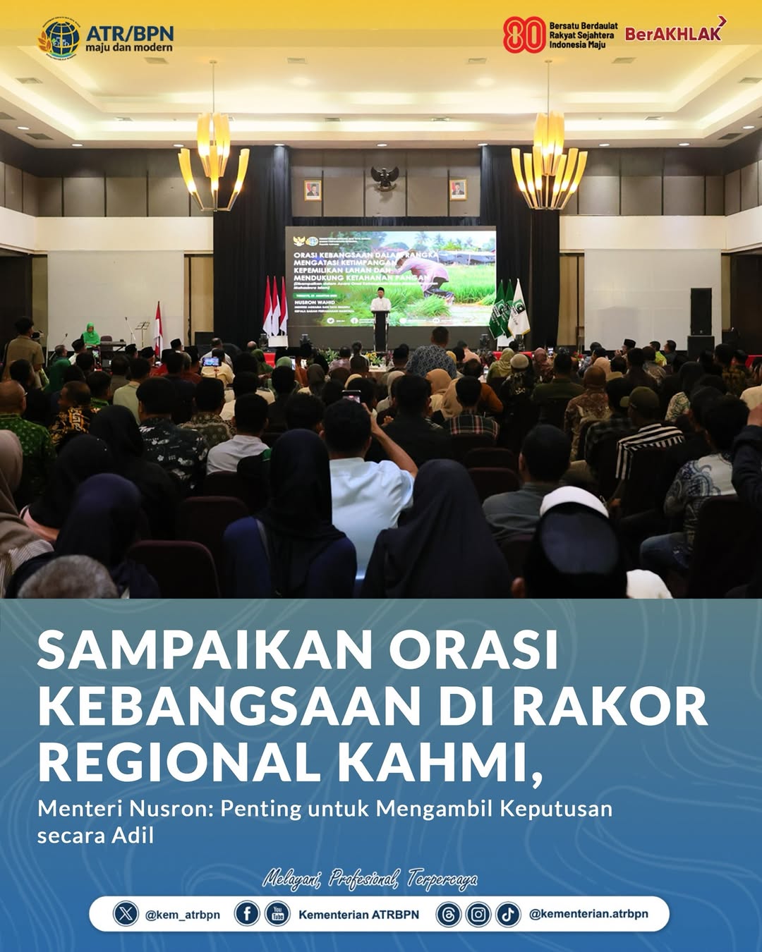BERITATOTABUAN.COM,.NASIONAL -Menteri Agraria dan Tata Ruang/Kepala Badan Pertanahan Nasional (ATR/BPN), Nusron Wahid, menyampaikan orasi kebangsaan dalam Rapat Koordinasi (Rakor) Regional Korps Alumni Himpunan Mahasiswa Islam (KAHMI), di Kota Ternate, Sabtu (23/08/2025). Dalam orasinya, ia menegaskan pentingnya menggunakan keadilan sebagai dasar dalam setiap kebijakan, khususnya terkait pengelolaan tanah nasional.