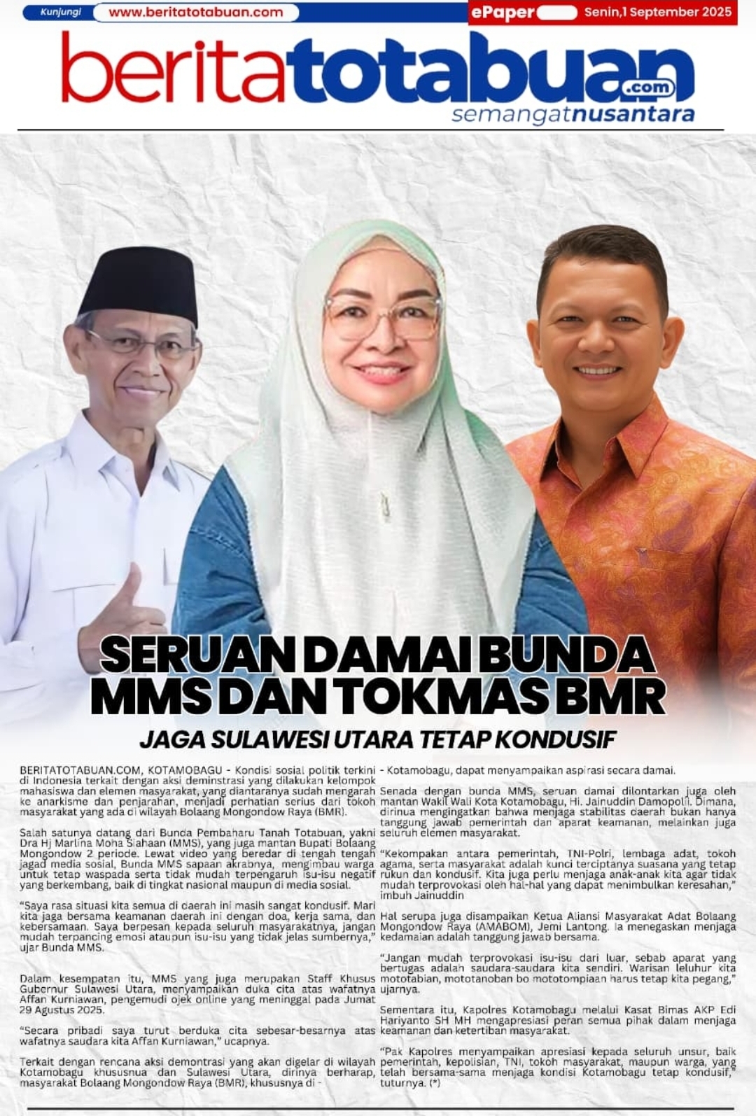 BERITATOTABUAN.COM, KOTAMOBAGU – Kondisi sosial politik terkini di Indonesia terkait dengan aksi deminstrasi yang dilakukan kelompok mahasiswa dan elemen masyarakat, yang diantaranya sudah mengarah ke anarkisme dan penjarahan, menjadi perhatian serius dari tokoh masyarakat yang ada di wilayah Bolaang Mongondow Raya (BMR).