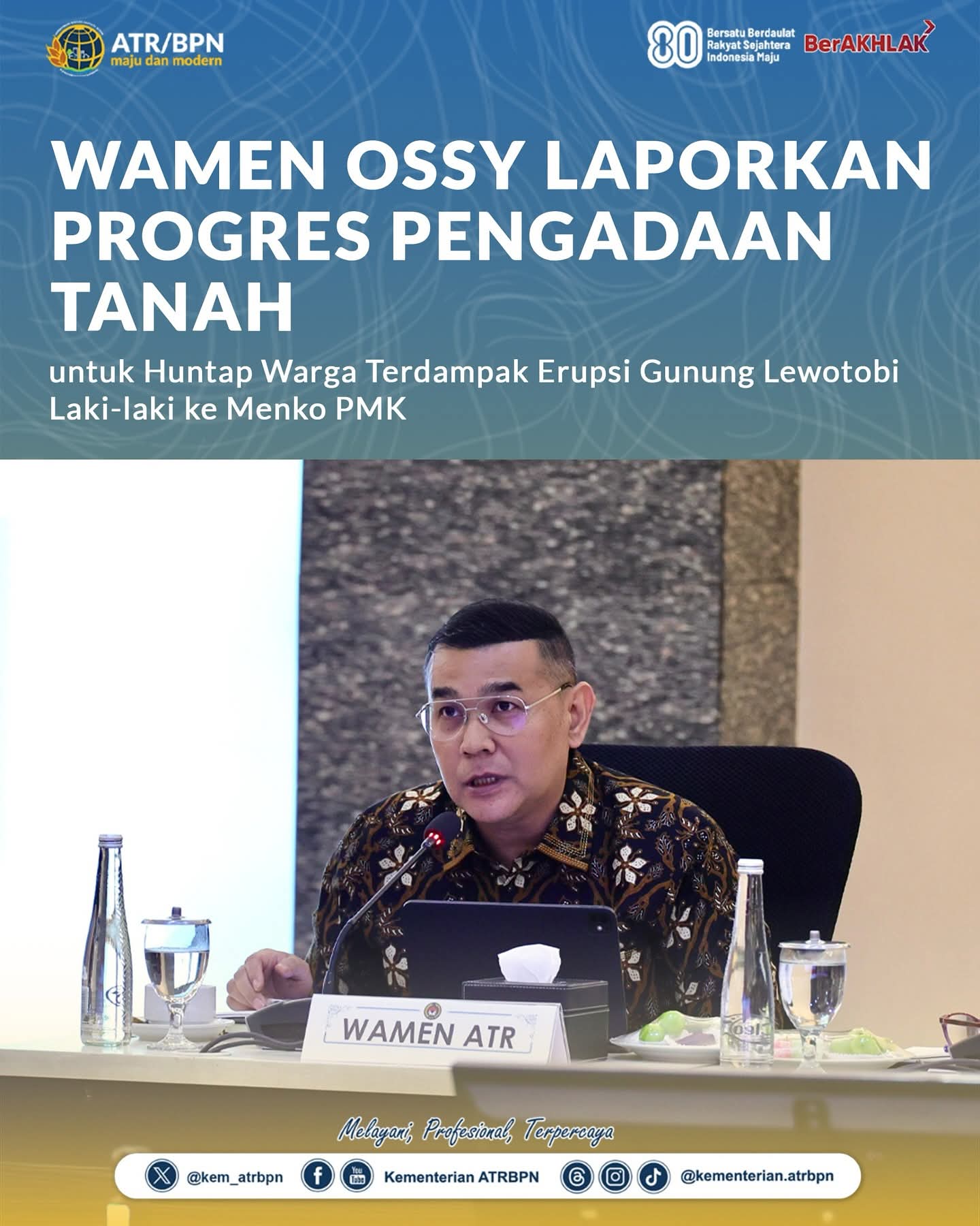 BERITATOTABUAN.COM, NASIONAL -Wakil Menteri Agraria dan Tata Ruang/Wakil Kepala Badan Pertanahan Nasional (Wamen ATR/Waka BPN), Ossy Dermawan, melaporkan progres pelaksanaan Pengadaan Tanah untuk hunian tetap (Huntap) bagi warga terdampak erupsi Gunung Lewotobi Laki-laki di Flores Timur, Nusa Tenggara Timur. Laporan ini disampaikan kepada Menteri Koordinator Bidang Pembangunan Manusia dan Kebudayaan (Menko PMK), Pratikno, dalam Rapat Tingkat Menteri yang berlangsung di Kemenko PMK, Jakarta, Kamis (21/08/2025).