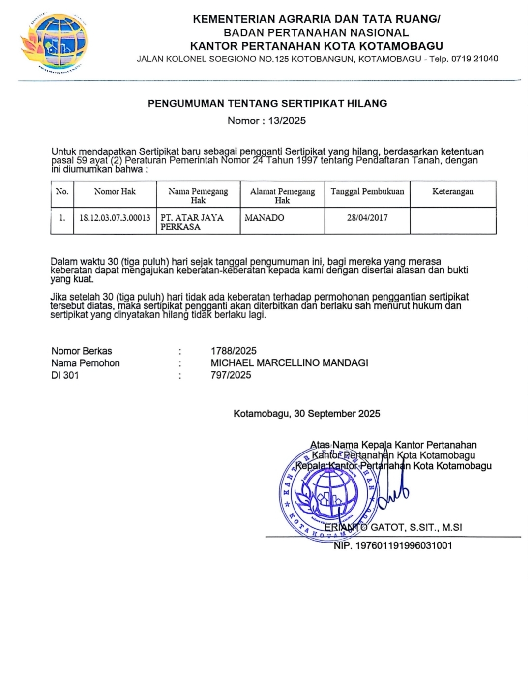 PENGUMUMAN SERTIFIKAT HILANG NOMOR 13/2025 ATAS NAMA PT ATAR JAYA PERKASAredaksiJumat, 3 Oktober 2025Berita Terkini, PENGUMUMAN22 Dilihat Views: 22 PENGUMUMAN SERTIFIKAT HILANG NOMOR 13/2025 ATAS NAMA PT ATAR JAYA PERKASA PENGUMUMAN SERTIFIKAT HILANG NOMOR 13/2025 ATAS NAMA PT ATAR JAYA PERKASA Postingan TerkaitSalurkan Bantuan Rp1,5 Miliar Bencana di Aceh, Sumatra Utara dan Barat, Gubernur : Ini Bentuk Kepedulian Pemerintah SulutPuluhan Triliun Selamat Dari Mafia Tanah, Nusron Ungkap Aset Rp23,3 Triliun Berhasil DiamankanHentikan Mafia Tanah: Menteri Nusron Ajak APH Pererat Kolaborasi di Rakor NasionalPerbaiki Ketimpangan Kepemilikan Tanah, Menteri Nusron Tegaskan Komitmen di UNDIPGenerasi Muda Terdidik Didorong Menteri Nusron Perkuat Tata Ruang Nasional di UNDIPKebut Layanan Pertanahan, Jadi Fokus Menteri Nusron di Akhir TahunTemui Pemerintah Nagasaki, Ketua TP-PKK Sampaikan Pesan Gubernur SulutPimpin Upacara HUT Korpri, Ini Pesan Wawali KotamobaguJangan LewatkanSalurkan Bantuan Rp1,5 Miliar Bencana di Aceh, Sumatra Utara dan Barat, Gubernur : Ini Bentuk Kepedulian Pemerintah SulutPuluhan Triliun Selamat Dari Mafia Tanah, Nusron Ungkap Aset Rp23,3 Triliun Berhasil DiamankanHentikan Mafia Tanah: Menteri Nusron Ajak APH Pererat Kolaborasi di Rakor NasionalPerbaiki Ketimpangan Kepemilikan Tanah, Menteri Nusron Tegaskan Komitmen di UNDIPGenerasi Muda Terdidik Didorong Menteri Nusron Perkuat Tata Ruang Nasional di UNDIPKebut Layanan Pertanahan, Jadi Fokus Menteri Nusron di Akhir Tahun