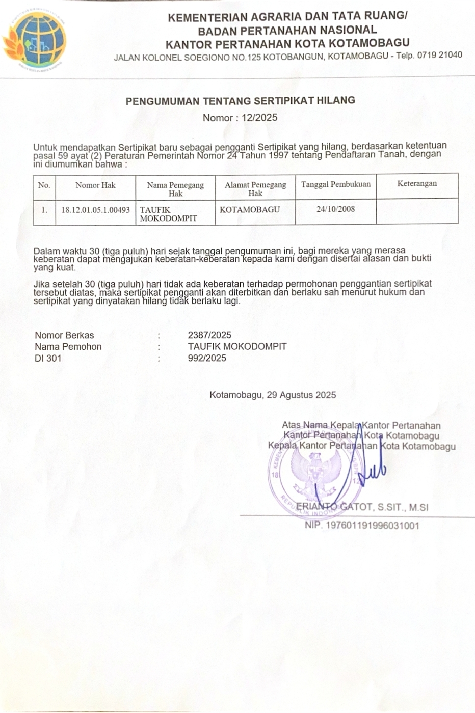 PENGUMUMAN SERTIPIKAT HILANG ATAS NAMA TAUFIK MOKODOMPIT NOMOR 12/2025redaksiRabu, 3 September 2025Berita Terkini, PENGUMUMAN, Seputar BMR537 Dilihat Views: 537 Postingan TerkaitRakor Tindak Pidana Pertanahan Tekankan Pencegahan Sejak DiniSoroti Metamorfosis Mafia Tanah, Menteri Nusron: Jangan Sampai TerlibatPemprov Gelar Pangan Murah dengan Harga Terjangkau Jelang Perayaan Natal dan Tahun Baru 2026Salurkan Bantuan Rp1,5 Miliar Bencana di Aceh, Sumatra Utara dan Barat, Gubernur : Ini Bentuk Kepedulian Pemerintah SulutPuluhan Triliun Selamat Dari Mafia Tanah, Nusron Ungkap Aset Rp23,3 Triliun Berhasil DiamankanHentikan Mafia Tanah: Menteri Nusron Ajak APH Pererat Kolaborasi di Rakor NasionalPerbaiki Ketimpangan Kepemilikan Tanah, Menteri Nusron Tegaskan Komitmen di UNDIPGenerasi Muda Terdidik Didorong Menteri Nusron Perkuat Tata Ruang Nasional di UNDIPJangan LewatkanRakor Tindak Pidana Pertanahan Tekankan Pencegahan Sejak DiniSoroti Metamorfosis Mafia Tanah, Menteri Nusron: Jangan Sampai TerlibatPemprov Gelar Pangan Murah dengan Harga Terjangkau Jelang Perayaan Natal dan Tahun Baru 2026Salurkan Bantuan Rp1,5 Miliar Bencana di Aceh, Sumatra Utara dan Barat, Gubernur : Ini Bentuk Kepedulian Pemerintah SulutPuluhan Triliun Selamat Dari Mafia Tanah, Nusron Ungkap Aset Rp23,3 Triliun Berhasil DiamankanHentikan Mafia Tanah: Menteri Nusron Ajak APH Pererat Kolaborasi di Rakor Nasional